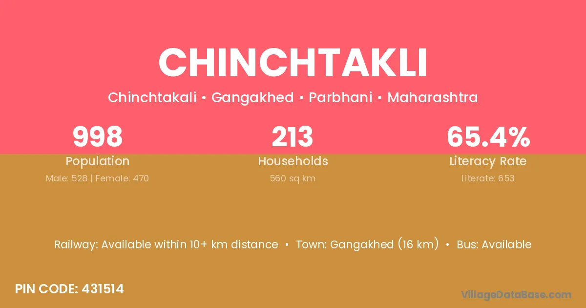 Gangakhed (16 km) is the nearest town to Chinchtakli village for major economic activities and is located approximately 16 km away.