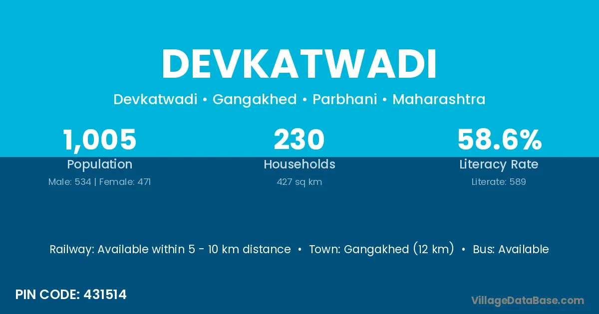 Gangakhed (12 km) is the nearest town to Devkatwadi village for major economic activities and is located approximately 12 km away.