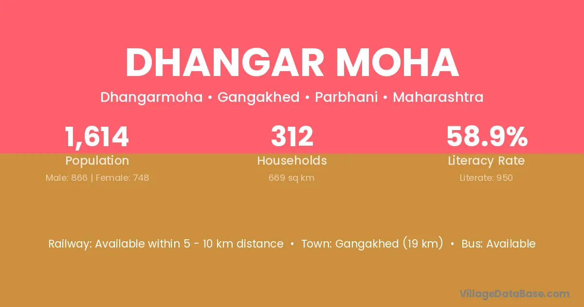 Gangakhed (19 km) is the nearest town to Dhangar Moha village for major economic activities and is located approximately 19 km away.
