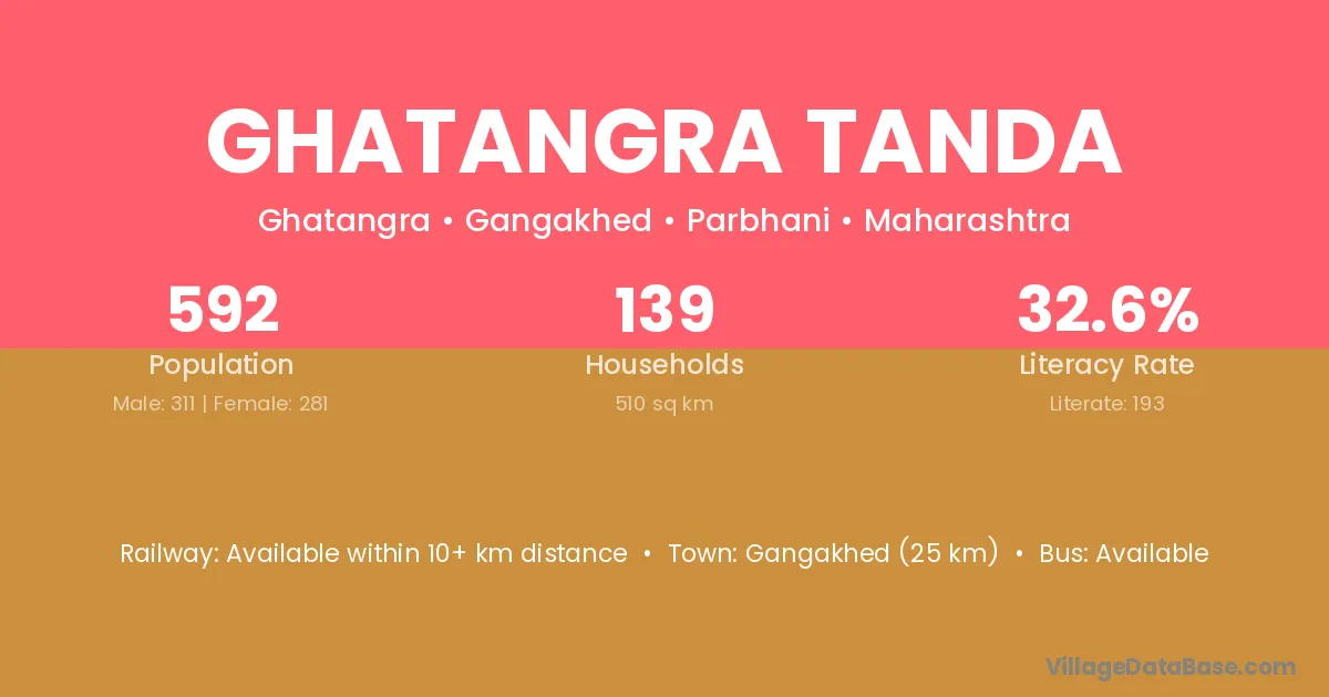 Gangakhed (25 km) is the nearest town to Ghatangra Tanda village for major economic activities and is located approximately 25 km away.