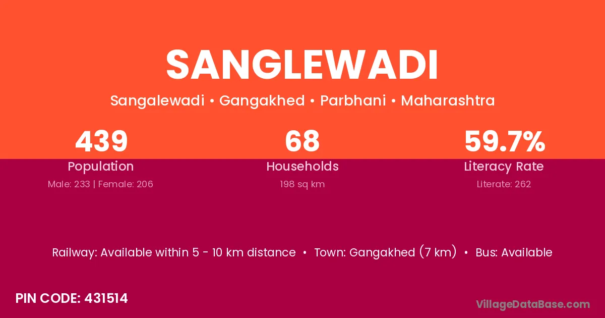 Gangakhed (7 km) is the nearest town to Sanglewadi village for major economic activities and is located approximately 7 km away.