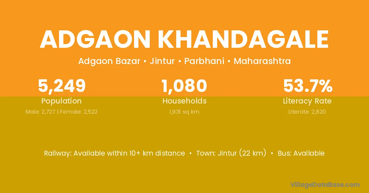 Jintur (22 km) is the nearest town to Adgaon Khandagale village for major economic activities and is located approximately 22 km away.