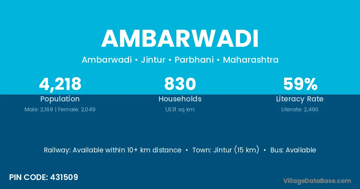 Jintur (15 km) is the nearest town to Ambarwadi village for major economic activities and is located approximately 15 km away.