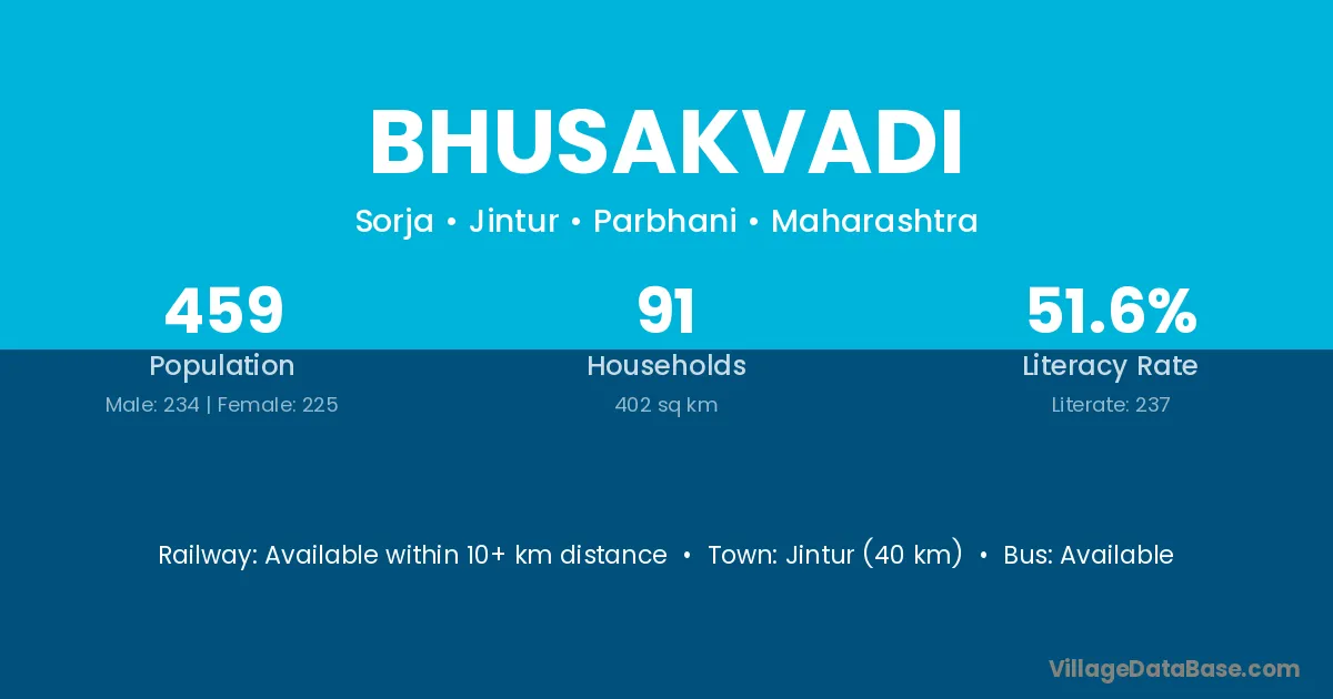 Jintur (40 km) is the nearest town to Bhusakvadi village for major economic activities and is located approximately 40 km away.