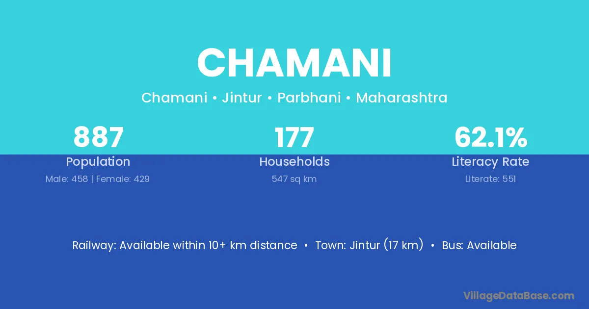 Jintur (17 km) is the nearest town to Chamani village for major economic activities and is located approximately 17 km away.