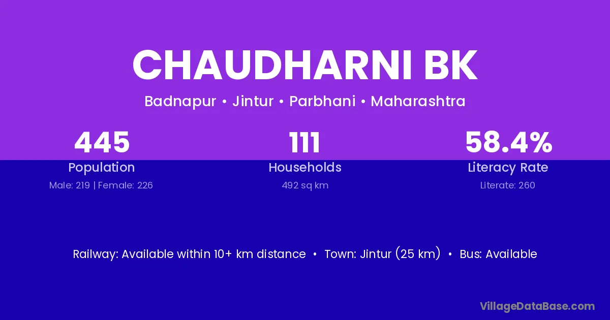 Jintur (25 km) is the nearest town to Chaudharni Bk village for major economic activities and is located approximately 25 km away.