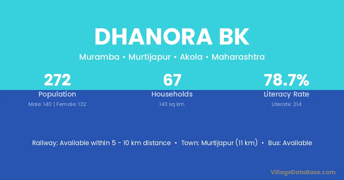 Dhanora Bk village has a total population of 1,731 people, of which 912 are males and 819 are females.