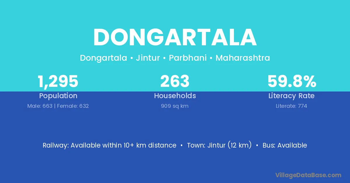 Jintur (12 km) is the nearest town to Dongartala village for major economic activities and is located approximately 12 km away.