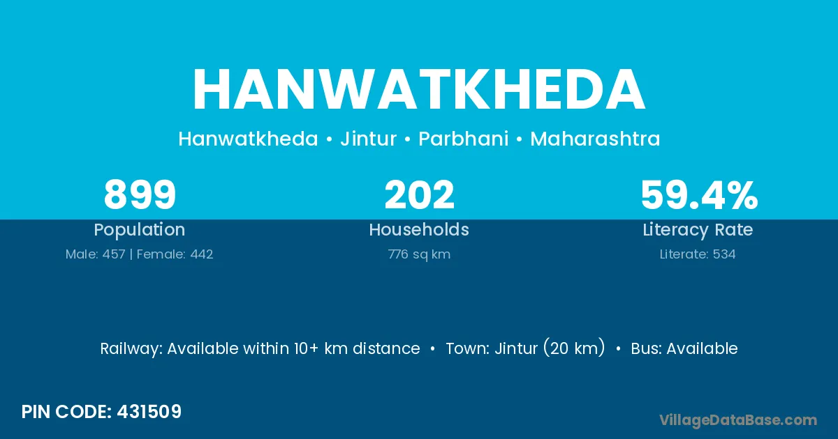 Jintur (20 km) is the nearest town to Hanwatkheda village for major economic activities and is located approximately 20 km away.