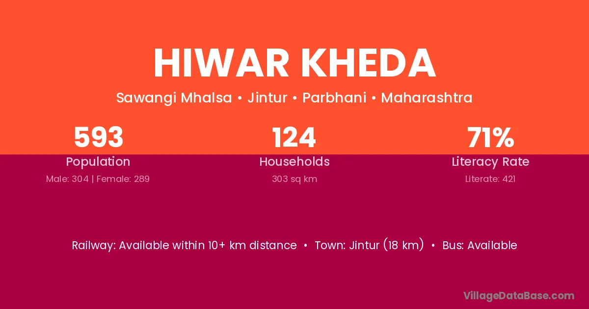 Jintur (18 km) is the nearest town to Hiwar Kheda village for major economic activities and is located approximately 18 km away.