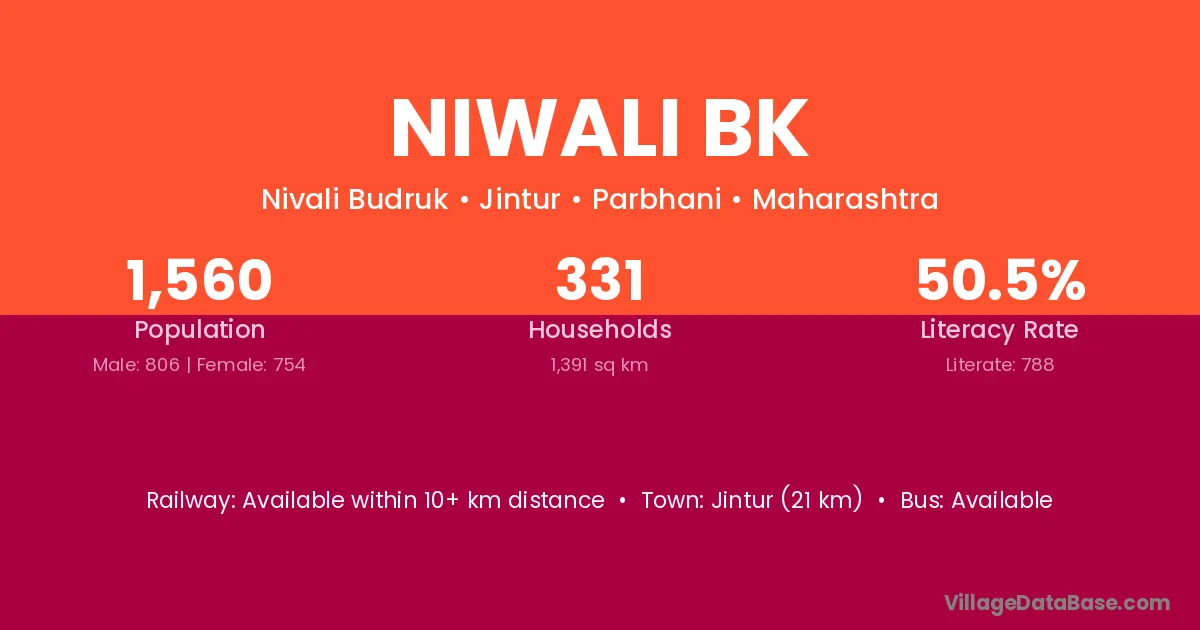 Jintur (21 km) is the nearest town to Niwali Bk village for major economic activities and is located approximately 21 km away.