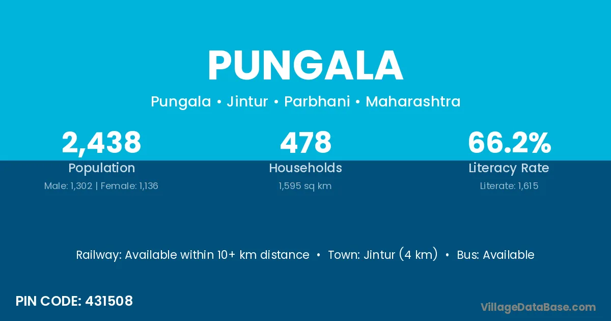 Jintur (4 km) is the nearest town to Pungala village for major economic activities and is located approximately 4 km away.