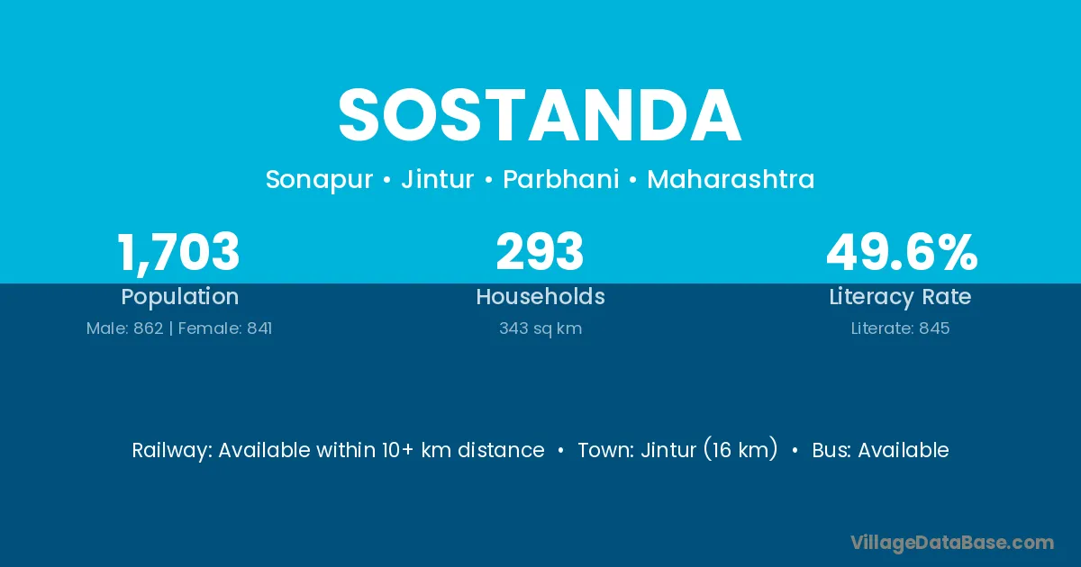 Jintur (16 km) is the nearest town to Sostanda village for major economic activities and is located approximately 16 km away.