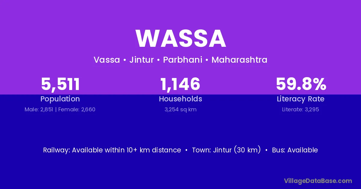 Jintur (30 km) is the nearest town to Wassa village for major economic activities and is located approximately 30 km away.