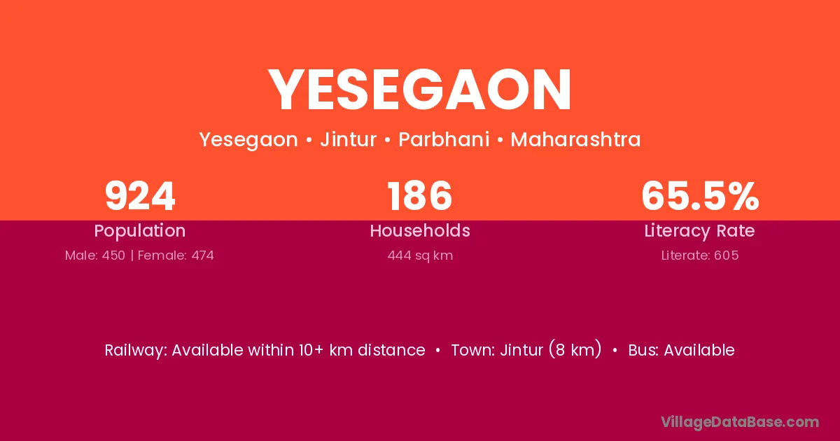 Jintur (8 km) is the nearest town to Yesegaon village for major economic activities and is located approximately 8 km away.
