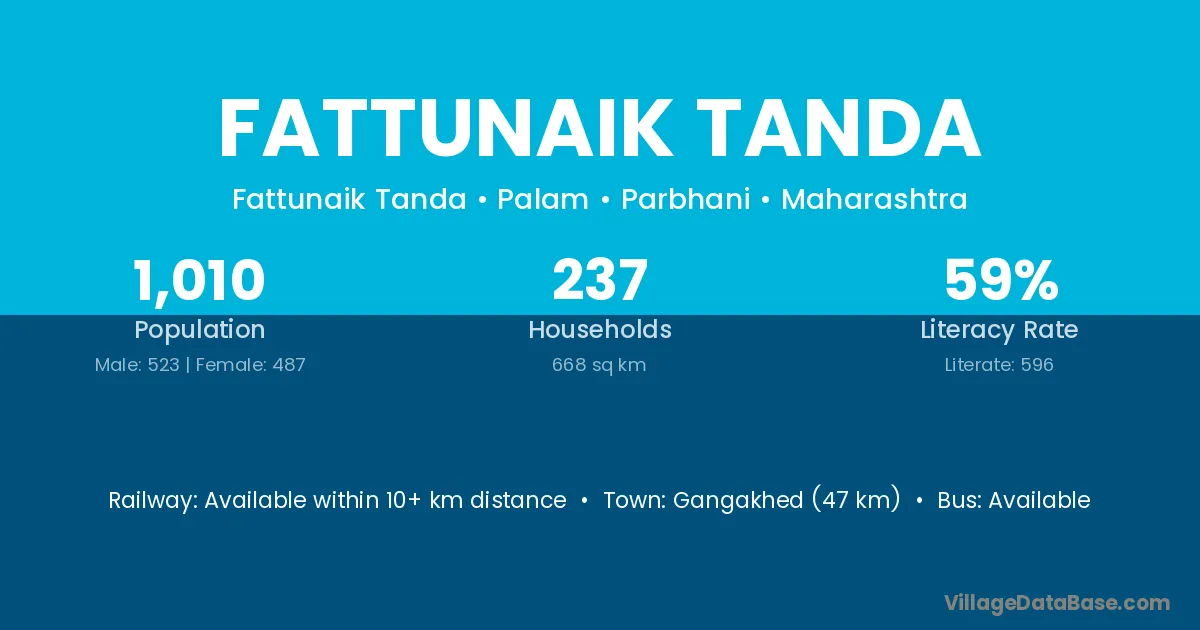 Gangakhed (47 km) is the nearest town to Fattunaik Tanda village for major economic activities and is located approximately 47 km away.