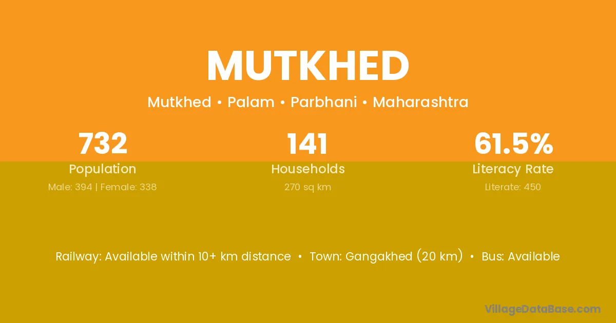 Gangakhed (20 km) is the nearest town to Mutkhed village for major economic activities and is located approximately 20 km away.