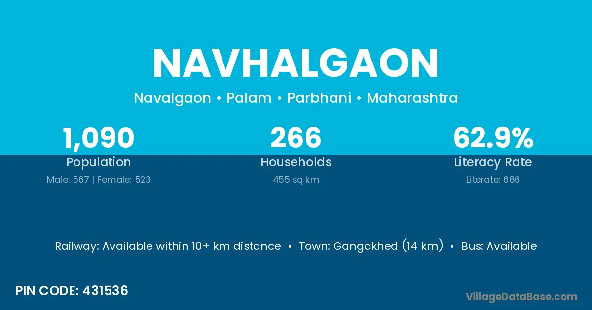 Gangakhed (14 km) is the nearest town to Navhalgaon village for major economic activities and is located approximately 14 km away.