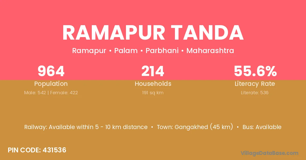 Gangakhed (45 km) is the nearest town to Ramapur Tanda village for major economic activities and is located approximately 45 km away.