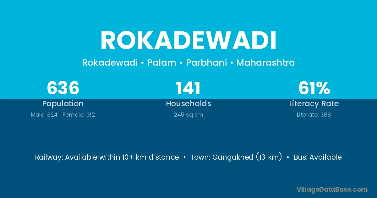 Gangakhed (13 km) is the nearest town to Rokadewadi village for major economic activities and is located approximately 13 km away.