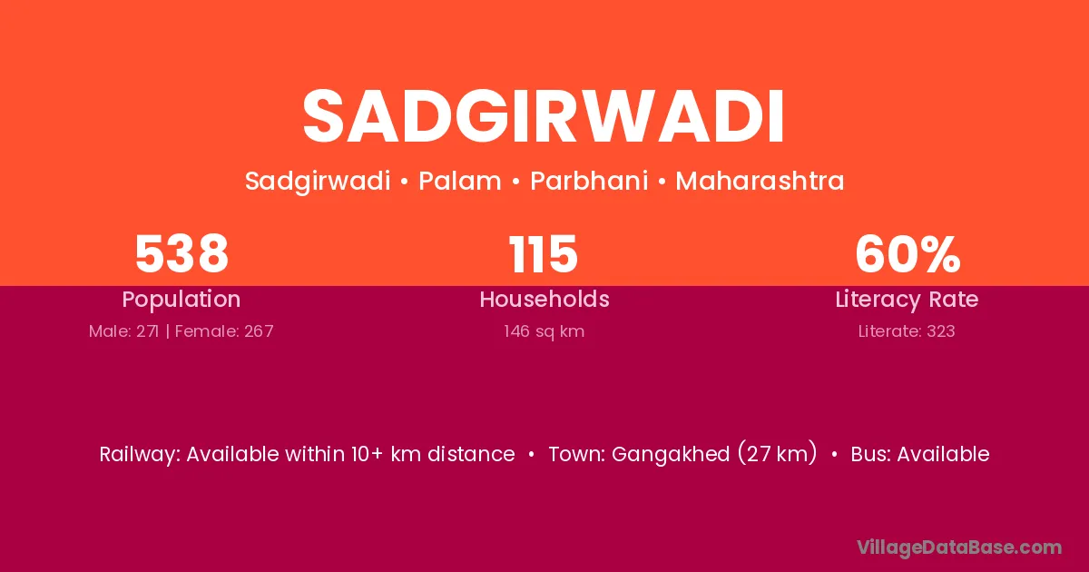 Sadgirwadi village has a total population of 538 people, of which 271 are males and 267 are females.
