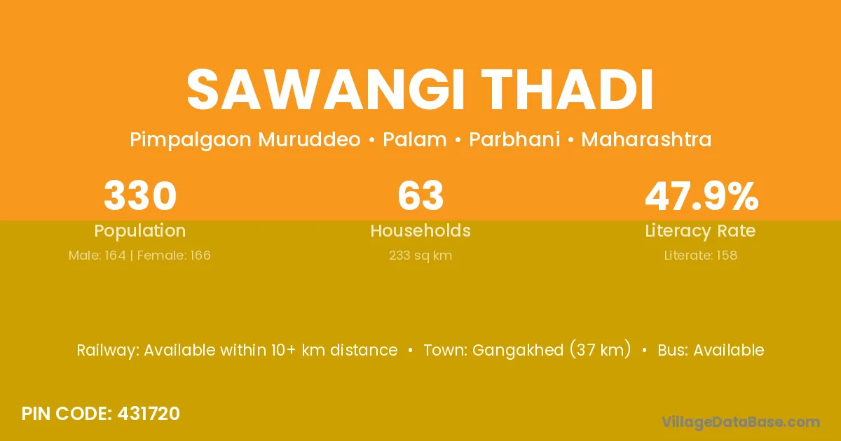 Gangakhed (37 km) is the nearest town to Sawangi Thadi village for major economic activities and is located approximately 37 km away.