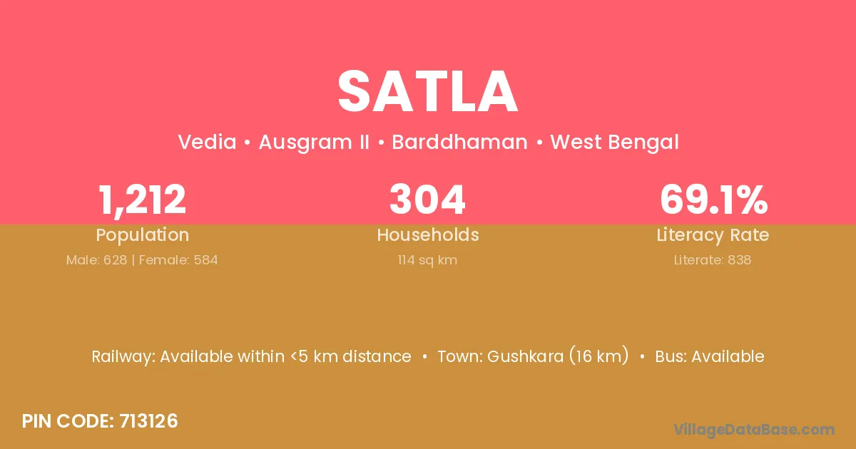 The literacy rate of Satla village is 51.05%. Male literacy stands at 60.19% and female literacy at 42.33%.