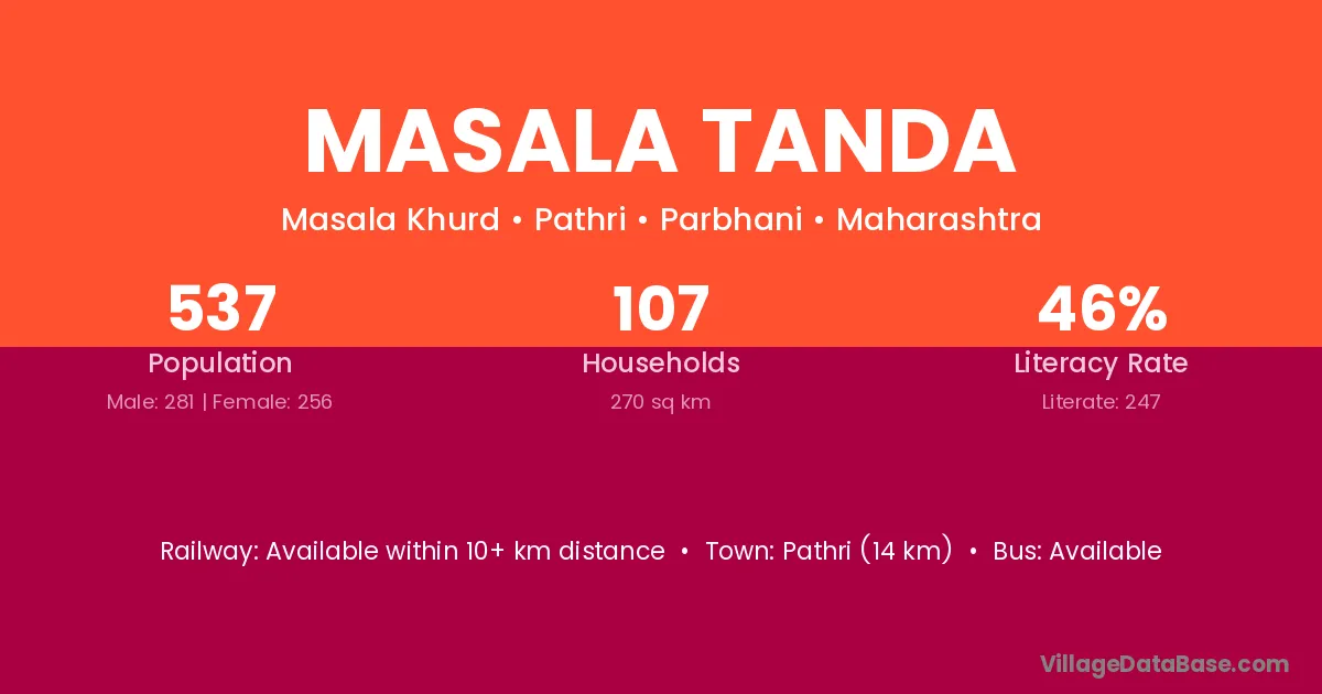 Pathri (14 km) is the nearest town to Masala Tanda village for major economic activities and is located approximately 14 km away.