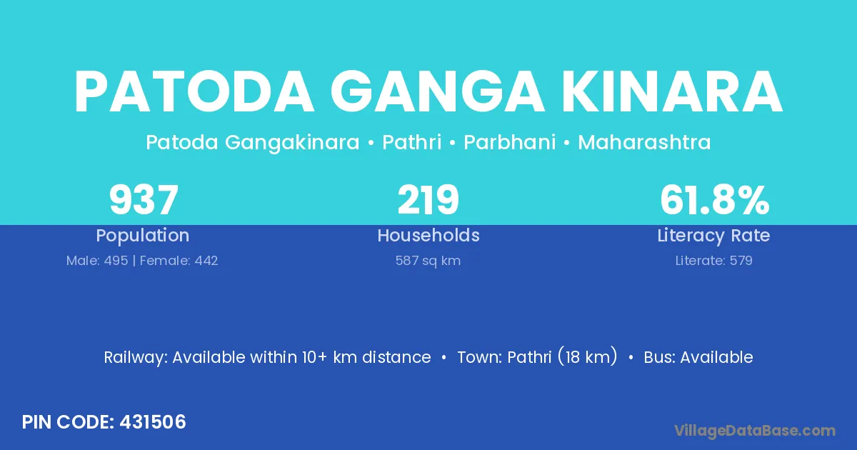 Patoda Ganga Kinara village has a total population of 937 people, of which 495 are males and 442 are females.