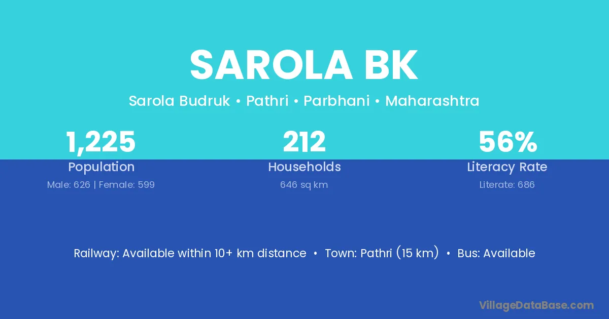 Sarola Bk village has a total population of 1,225 people, of which 626 are males and 599 are females.