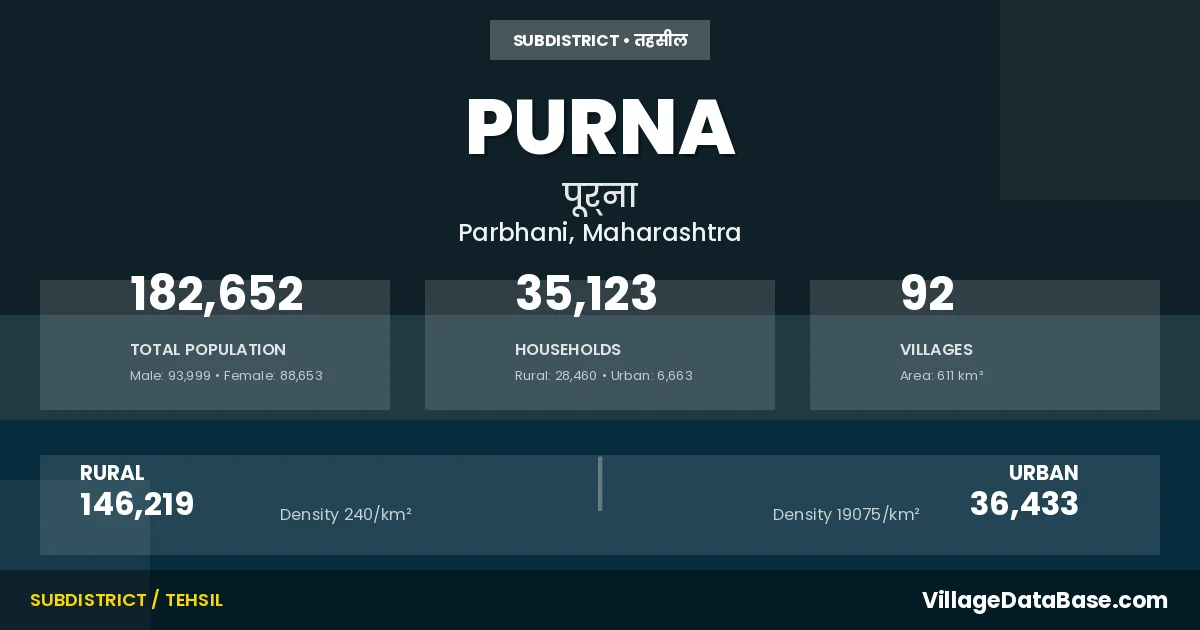 According to the 2011 census The total area of Purna Tehsil is 611 km², with a population of 182652 people. The population density is 299 inhabitants per square kilometre, and there are approximately 35123 houses in the sub district.
