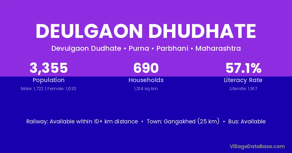 Gangakhed (25 km) is the nearest town to Deulgaon Dhudhate village for major economic activities and is located approximately 25 km away.