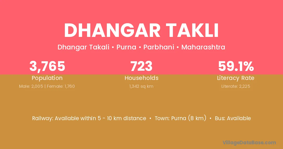 Dhangar Takli village has a total population of 3,765 people, of which 2,005 are males and 1,760 are females.