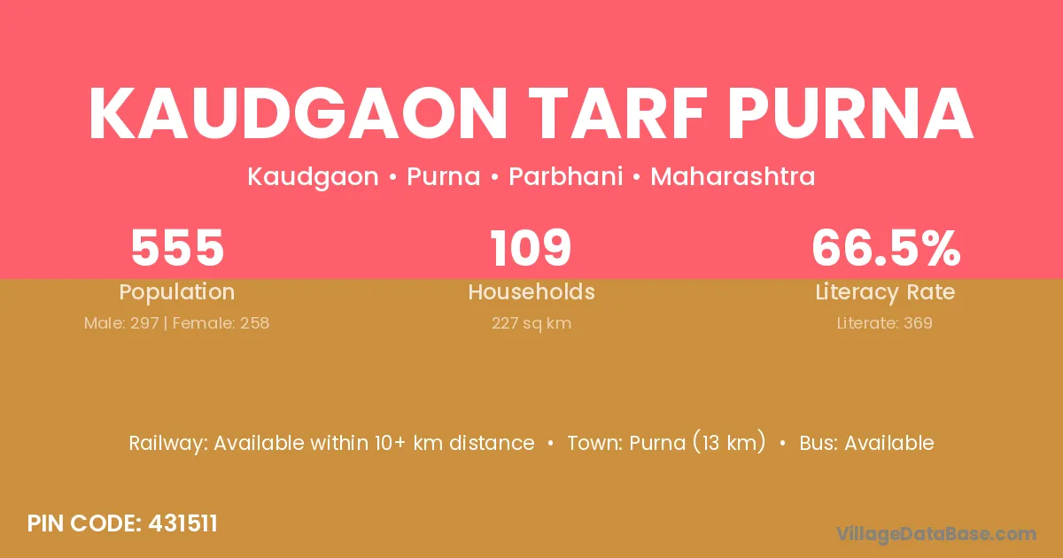 Kaudgaon Tarf Purna village has a total population of 555 people, of which 297 are males and 258 are females.