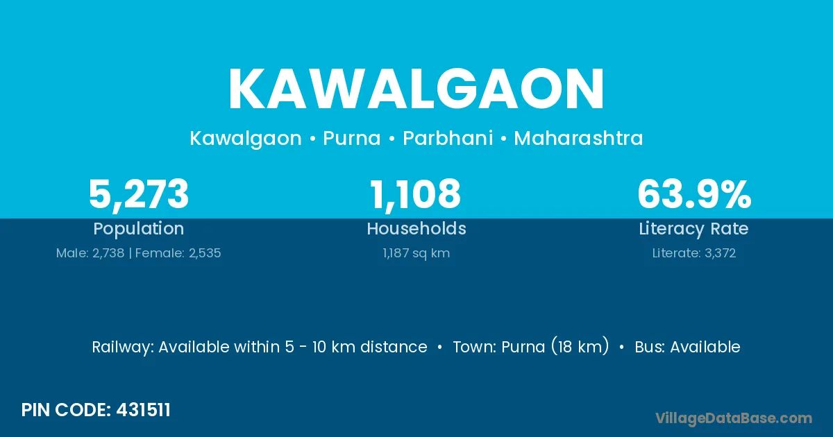 Purna (18 km) is the nearest town to Kawalgaon village for major economic activities and is located approximately 18 km away.