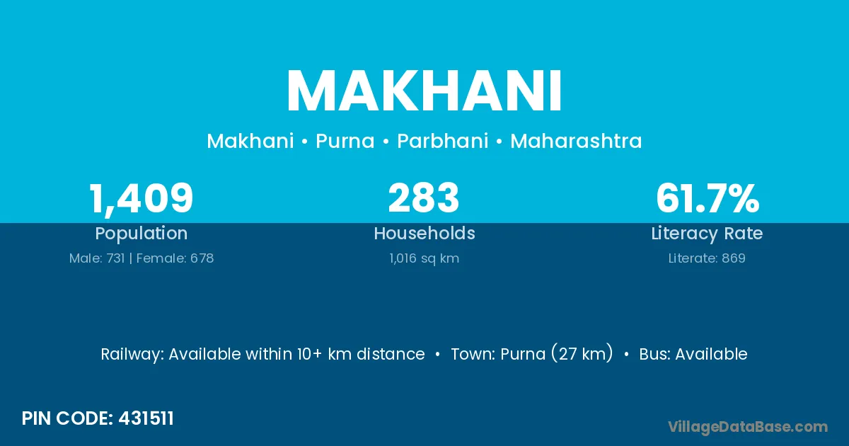 Purna (27 km) is the nearest town to Makhani village for major economic activities and is located approximately 27 km away.