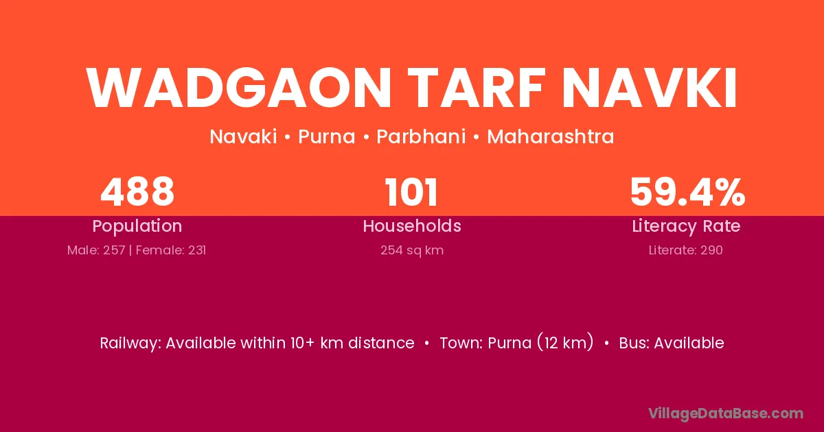 Wadgaon Tarf Navki village has a total population of 488 people, of which 257 are males and 231 are females.