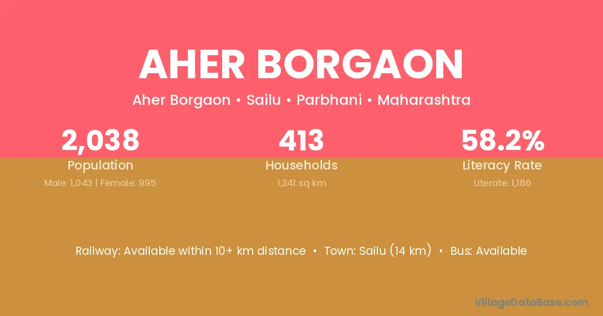 Aher Borgaon village has a total population of 2,038 people, of which 1,043 are males and 995 are females.