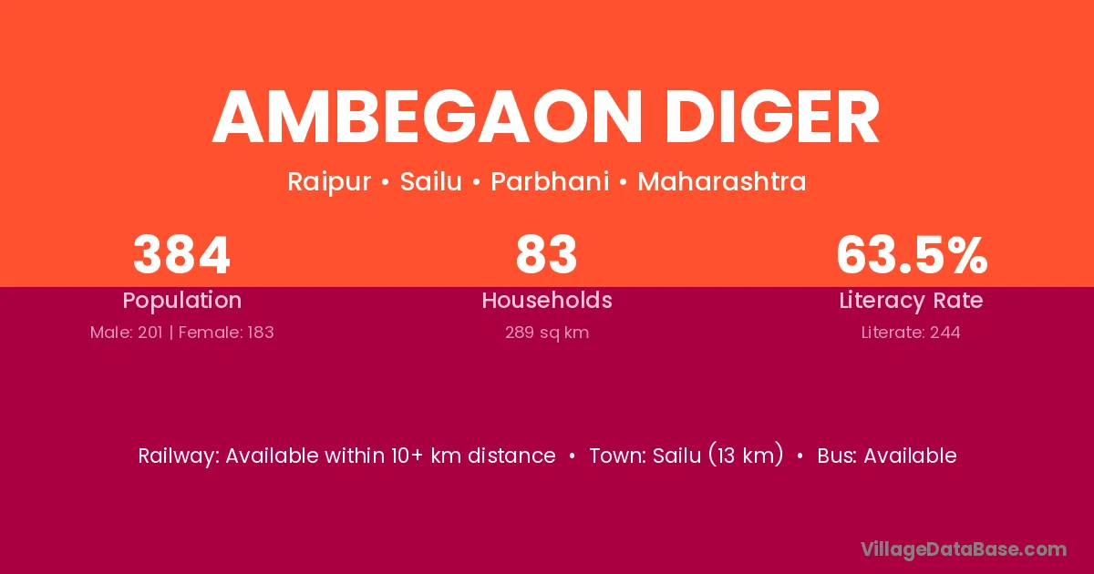Sailu (13 km) is the nearest town to Ambegaon Diger village for major economic activities and is located approximately 13 km away.