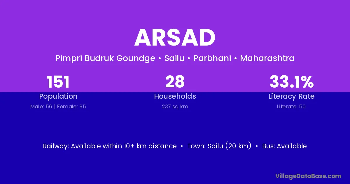 Sailu (20 km) is the nearest town to Arsad village for major economic activities and is located approximately 20 km away.