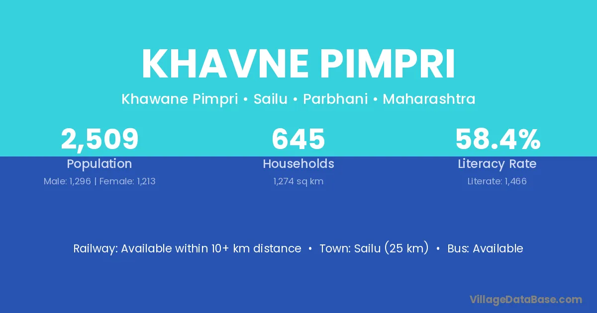 Sailu (25 km) is the nearest town to Khavne Pimpri village for major economic activities and is located approximately 25 km away.