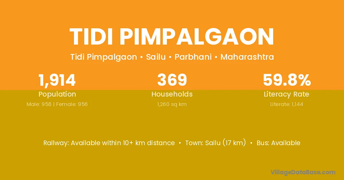 Sailu (17 km) is the nearest town to Tidi Pimpalgaon village for major economic activities and is located approximately 17 km away.