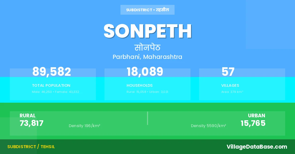According to the 2011 census The total area of Sonpeth Tehsil is 379 km², with a population of 89582 people. The population density is 237 inhabitants per square kilometre, and there are approximately 18089 houses in the sub district.