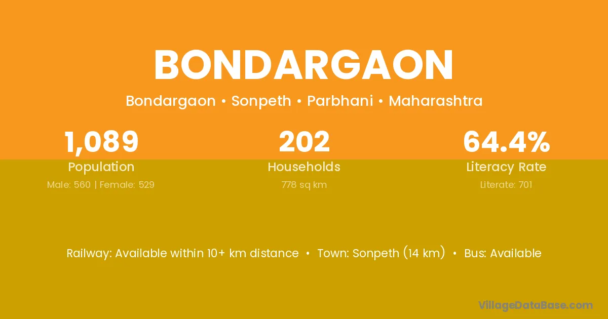 Bondargaon village has a total population of 1,089 people, of which 560 are males and 529 are females.