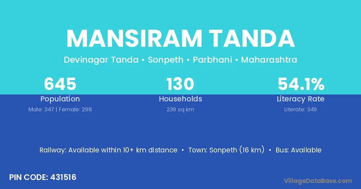 Sonpeth (16 km) is the nearest town to Mansiram Tanda village for major economic activities and is located approximately 16 km away.