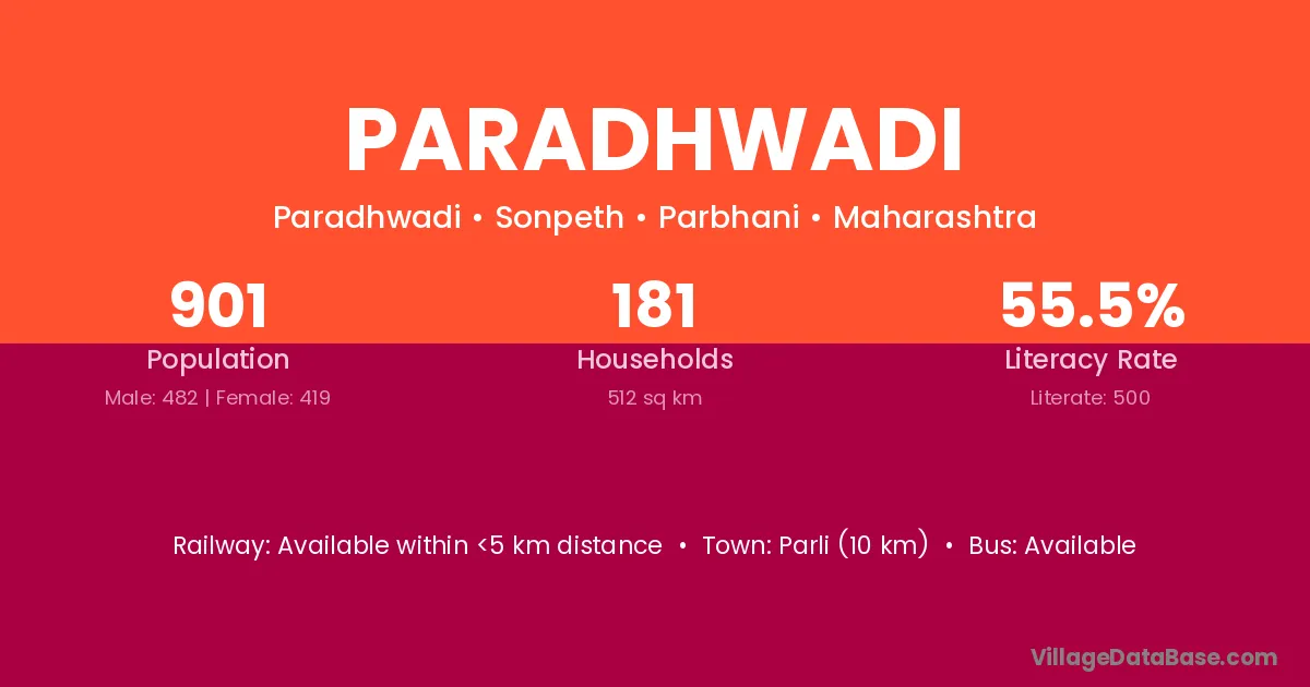 Paradhwadi village has a total population of 901 people, of which 482 are males and 419 are females.