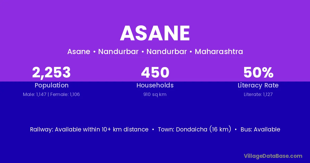 Junnar (68 km) is the nearest town to Asane village for major economic activities and is located approximately 68 km away.