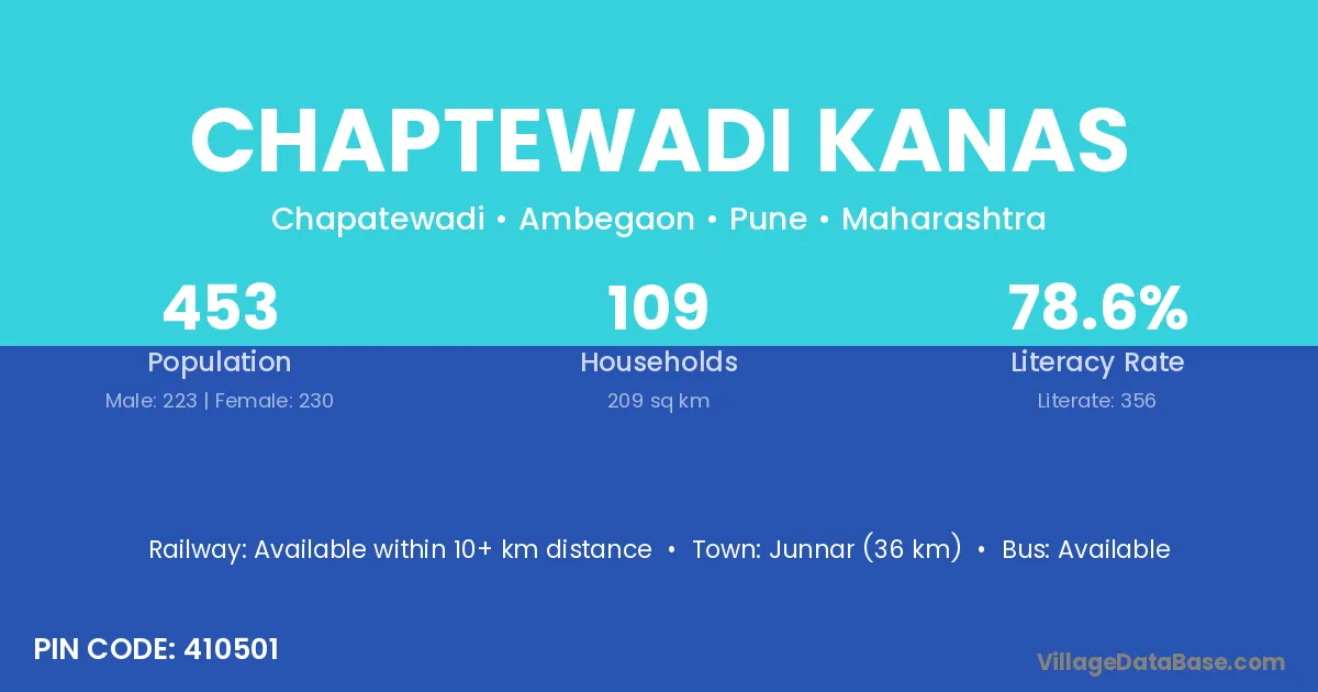 Junnar (36 km) is the nearest town to Chaptewadi Kanas village for major economic activities and is located approximately 36 km away.