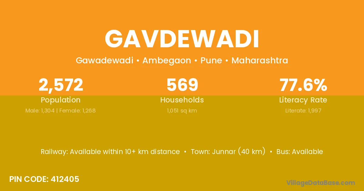 Junnar (40 km) is the nearest town to Gavdewadi village for major economic activities and is located approximately 40 km away.