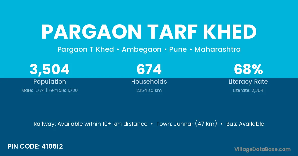 Junnar (47 km) is the nearest town to Pargaon Tarf Khed village for major economic activities and is located approximately 47 km away.